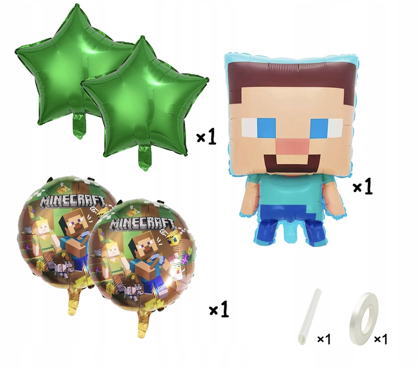 - 1 x balon foliowy Steve – wysokość ok. 66 cmKultowy bohater Minecraft w dużym formacie – idealny jako centralna dekoracja lub tło do zdjęć.