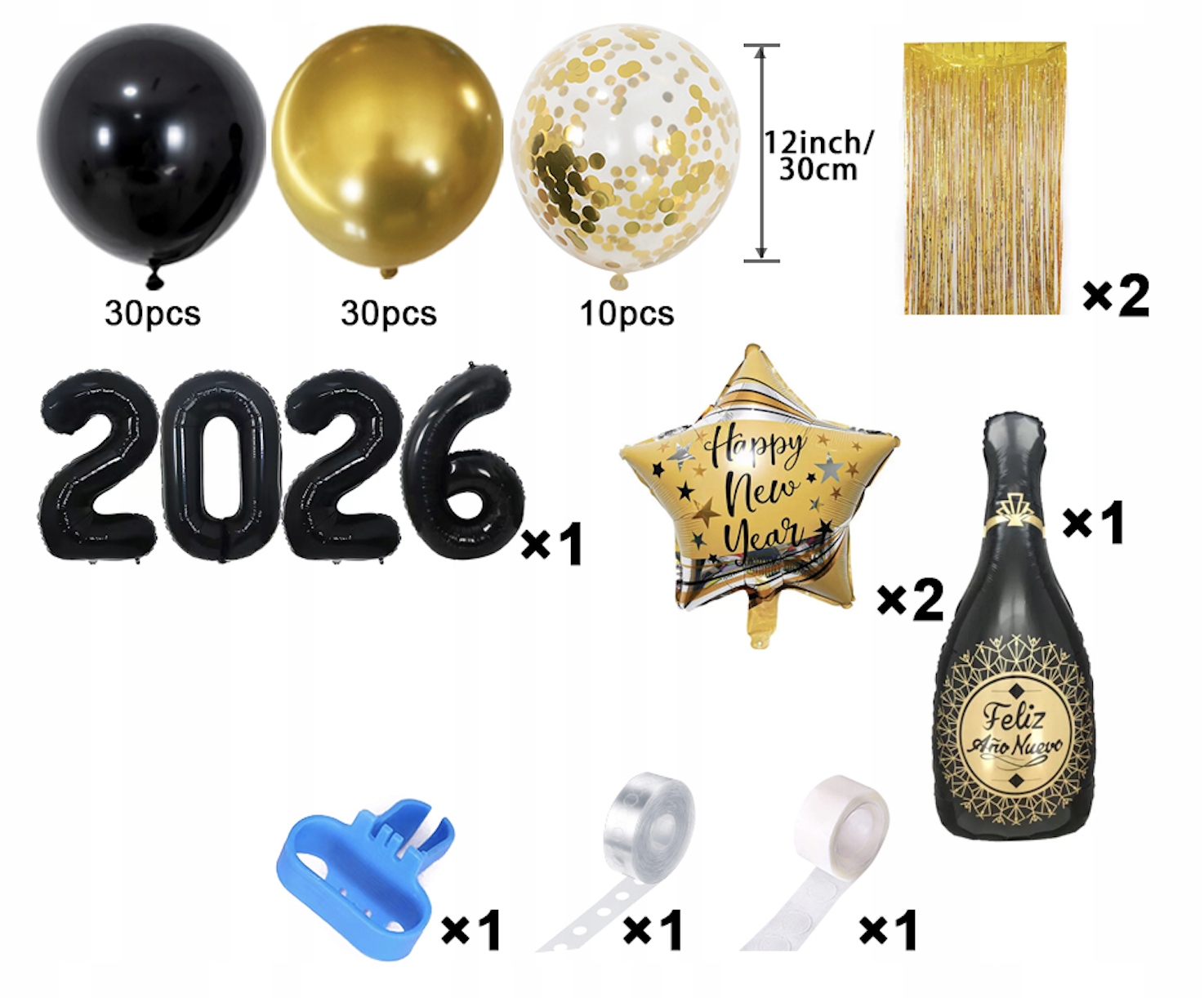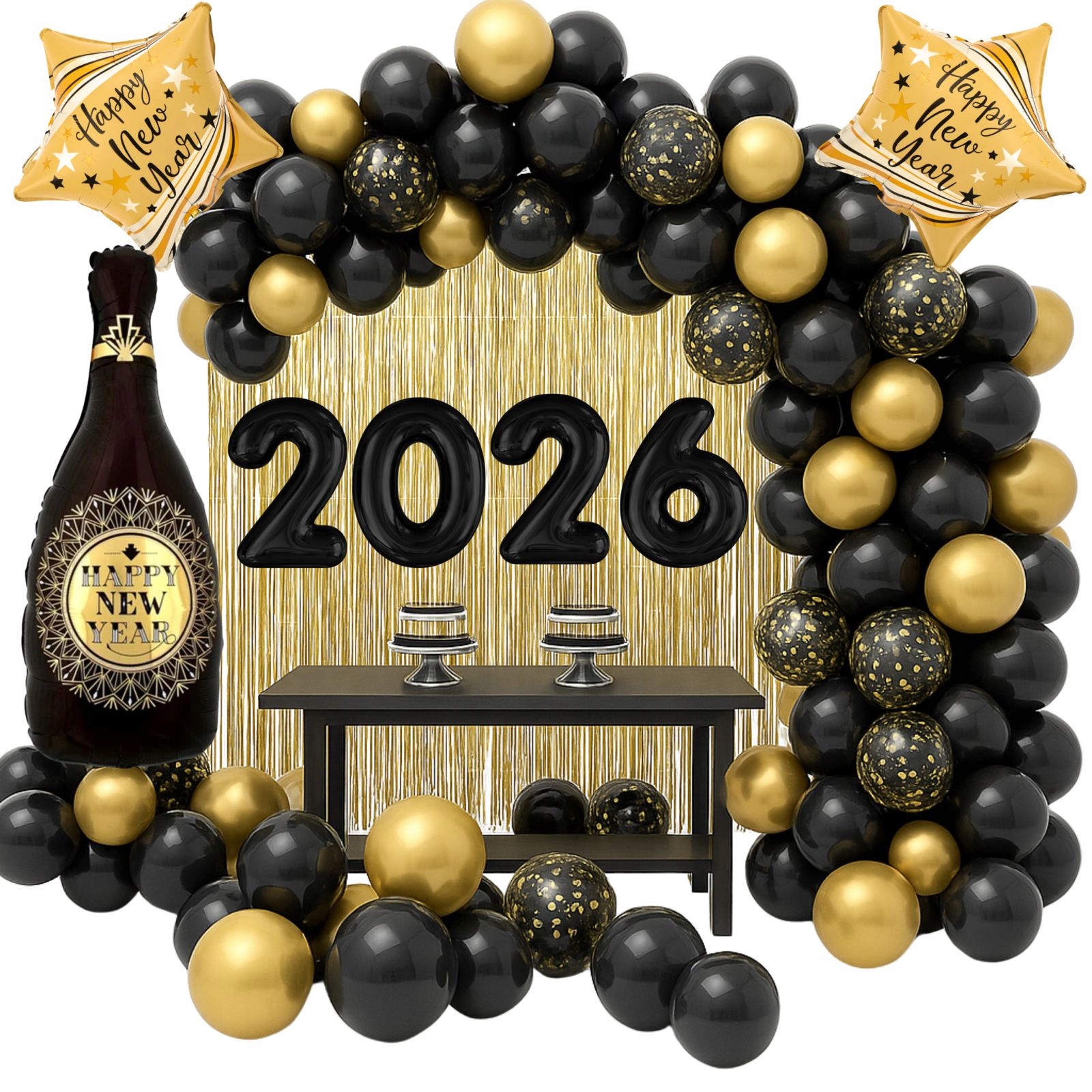 Stwórz niezwykłą oprawę na noc pełną blasku! Ten zestaw dekoracji w eleganckiej czerni i złocie odmieni każde przyjęcie sylwestrowe, doda klasy, stylu i stworzy idealne tło do niezapomnianych zdjęć.