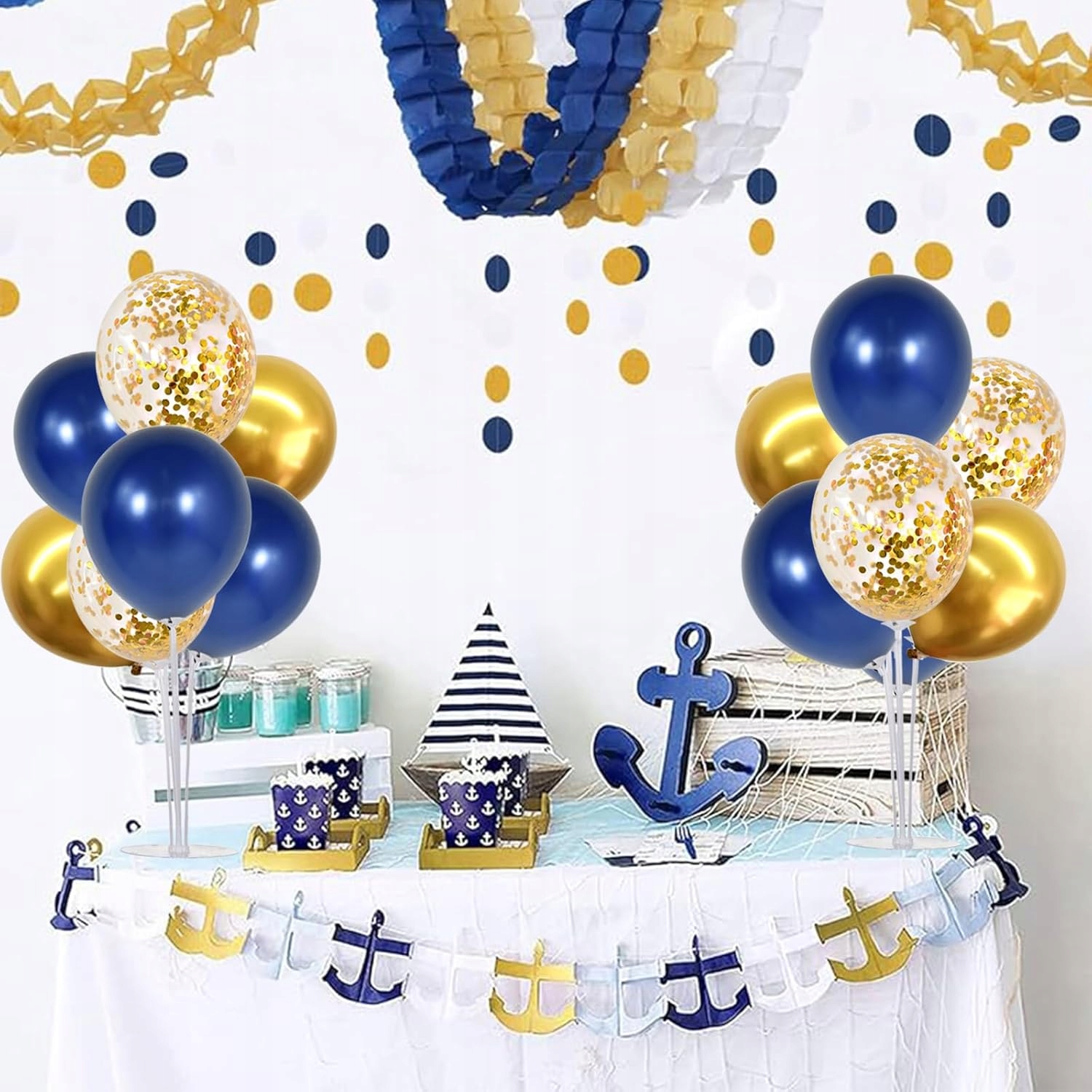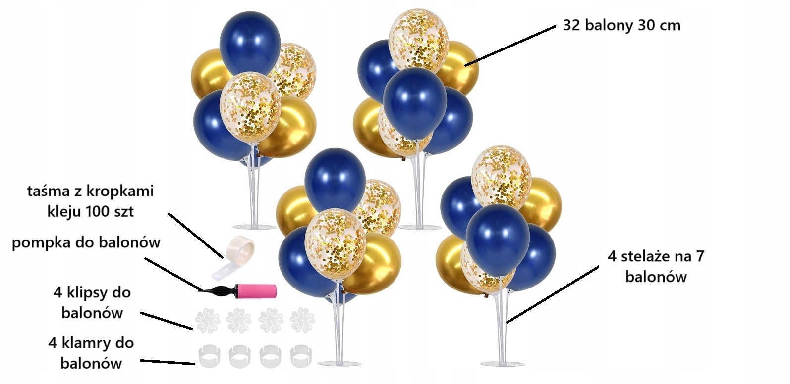 Zestaw 4 stojaków 70 cm z balonami w kolorze złotym / granatowym / przeźroczystych z konfetti + akcesoria