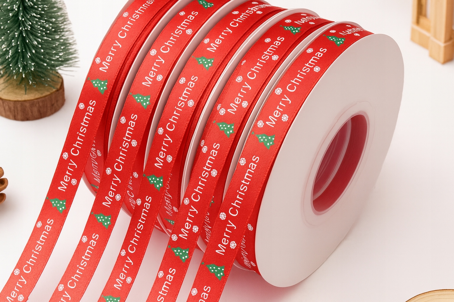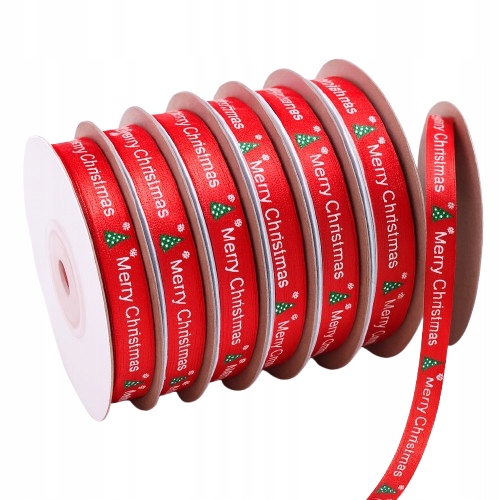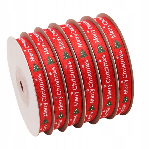 CZERWONA ŚWIĄTECZNA WSTĄŻKA SATYNOWA 1cm x 9m – MERRY CHRISTMAS